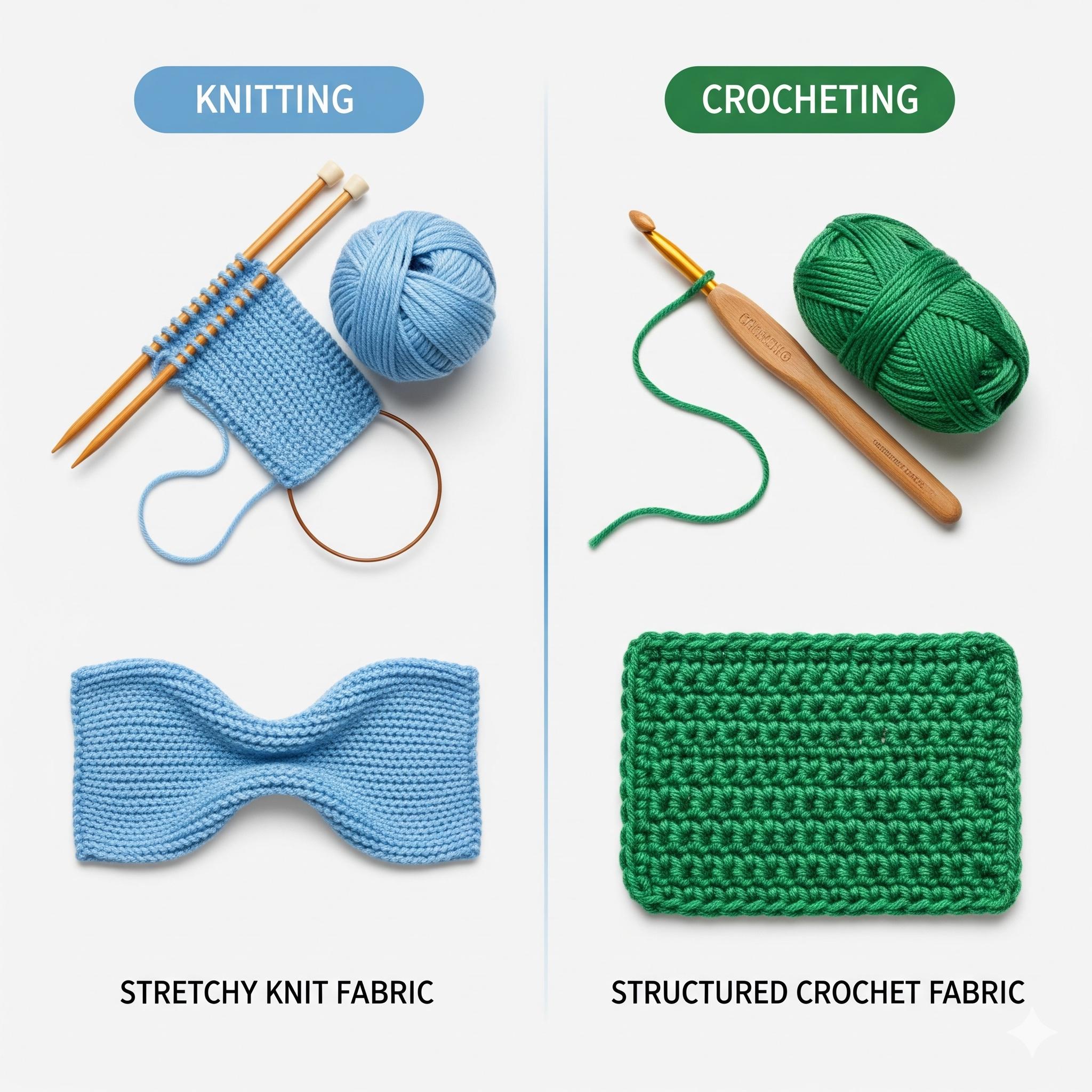 Crochet uses one hook to manipulate yarn, while knitting requires managing two needles and keeping multiple stitches active simultaneously. This fundamental difference means: